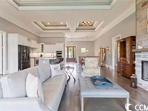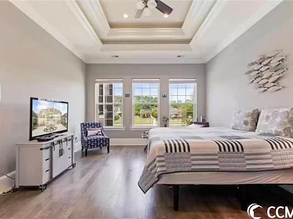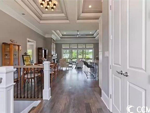 Located near the picturesque Marsh Walk area, this exceptional beach home is a true standout. With five bedrooms and four and a half baths, it offers ample space and luxurious features for a sophisticated living experience.Situateed on .6 acre homesite, the exterior of the property is equally impressive providing a perfect balance between proximity to the ocean and the Intracoastal Waterway (Waccamaw River). Well-maintained, completely fenced with an irrigation system, the yard is perfect for relaxation and entertainment with its own salt water pool. The elegance of this home is evident from the moment you step foot inside. The main level showcases open concept with a remarkable 20-foot ceiling consisting of three separate double tray ceilings and double crown molding, creating an airy and inviting atmosphere. The kitchen on this level is a culinary’s dream featuring stainless steel appliances and a granite island. The standout primary bedroom provides a tranquil escape with double tray ceiling leading to an expansive primary bathroom. The owner’s bathroom is a true masterpiece, featuring bluetooth surround system, double rain showers, double vanities and a huge soaking tub. The top floor of the home offers wall to wall sliders leading to a screened lanai with gas fireplace and outdoor kitchen. The home includes office space that provides a quiet and inspiring area for work or study. Two additional bedrooms with double tray ceilings, each with its own private bathroom, complete the top floor, making it ideal for accommodating guests or family members in style and comfort. The first level is home to extra long two-car gagrages with storage, as well as an In-Law Suite complete with bedroom, full bathroom with tub and shower, a kitchen, den, and living area. Step outside the wall to wall sliding doors on this level to your covered patio and pool. Watch the beautiful sunsets as you sit at your firepit overlooking the water and illuminated fountain. Arched doorways, coffered/tray ceilings, bullet-nosed wall corners are just some of the examples of high-quality materials and attention to details. For boaters, the HOA Ammenities include a boat launch that will take you to the Intracoastal Waterway.