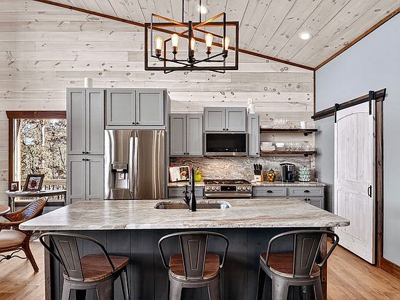 Welcome to this stunning mountain retreat, where elegance, comfort, and breathtaking views come together in perfect harmony. This beautiful Mountain Modern home features three spacious bedrooms, three and a half bathrooms, and an abundance of thoughtful upgrades throughout. Step inside to an inviting open-concept living area highlighted by gleaming wood floors, a cozy gas fireplace, and expansive windows that frame panoramic mountain vistas. The gourmet kitchen is a chef's dream, boasting granite countertops, upgraded stainless steel appliances, and a large pantry for all your storage needs and a laundry on each level. Each bathroom exudes craftsmanship and style, with beautiful tile work, granite countertops, a bar on terrace level and a custom wood-crafted vanity in one of the baths for a touch of rustic charm and a huge terrace level storage/closet room. This home offers gas fireplaces on each level for cozy gatherings, and a wood-burning fireplace outside—perfect for entertaining under the stars. Enjoy the outdoors from not one, but two expansive decks plus an additional party deck, all designed to take full advantage of the spectacular mountain scenery. Downstairs, the terrace level features luxury vinyl flooring, a second living area, and space ideal for relaxation or recreation. There's also a dedicated office, perfect for remote work or creative pursuits. Additional features include beautiful designer light fixtures, a two-car carport, full house generator, paved road access, and plenty of space to entertain, unwind, and enjoy mountain living at its finest. Whether as a full-time residence or a vacation getaway, this home offers the perfect blend of luxury, warmth, and natural beauty—a true mountain masterpiece.