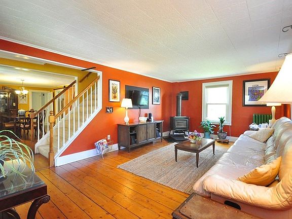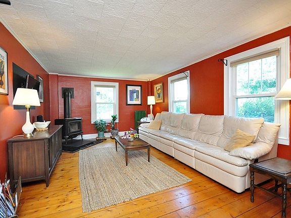 Wildflowers abound at this tranquil home in the Berkshires. You'll instantly feel the comfortable coziness of this 1800s home, while being pleasantly surprised by the energy efficiency (solar & HE wood stove). Upon entering the 3 season porch you'll fall in love with the glass paned French doors that open to the living room, dining room and main staircase. This home features wood floors throughout most rooms (some wide-plank!) and many coffered ceilings. The wood stove in the living room adds warmth. The living room is open to the large dining room which has a beautiful barn door leading into a bedroom and the half bath. You'll find the kitchen and laundry room at the back of the home. The bright kitchen has a gas stove, refrigerator (1 yr old), dishwasher (1 mo old) (APO). Up the wide, carpeted staircase you will find two generously sized bedrooms with wood floors, one with built in shelving. The large main bathroom has coffered ceilings and many built in cabinets. Welcome Home!