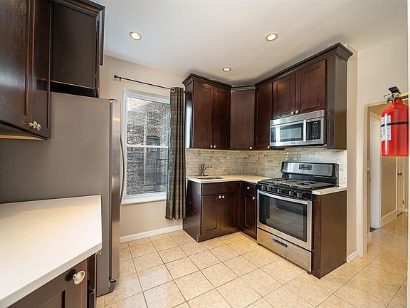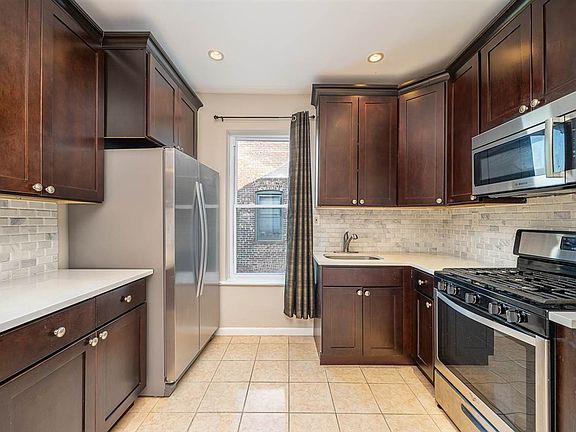Recently renovated top floor unit in Highlands Arms, a pre-war building in Journal Square. Condo features include high ceilings, with recessed lighting throughout. Hardwood floors in living room and bedroom. Entrance and kitchen floor is tiled in neutral tones. Kitchen features stainless steel appliances and 42' cabinets. Large windows in every room bring in natural light. Plenty of storage with deep closets. Window A/C included. Laundry in basement. Short walk to Journal Square PATH.