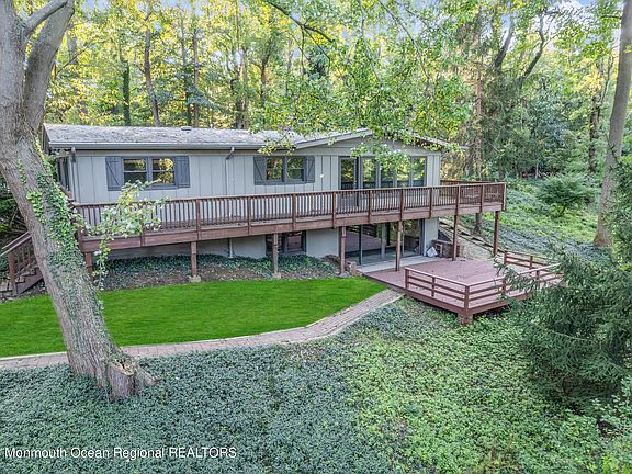 The exterior of the home features a wrap-around deck, perfect for enjoying the serene views of the surrounding woods. Imagine the possibilities of outdoor entertainment and relaxation in this natural paradise.