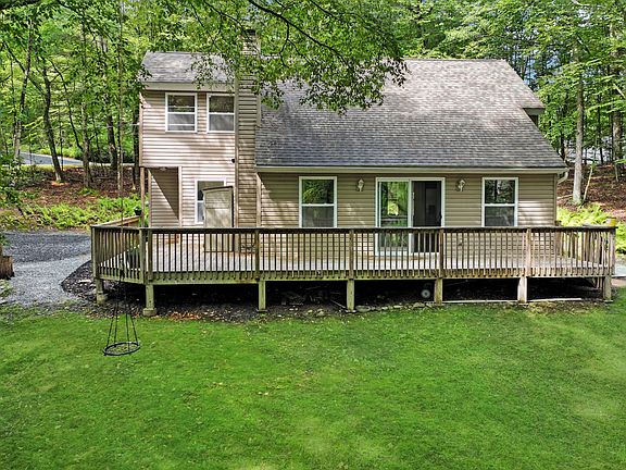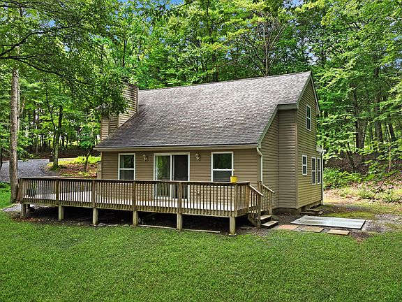 RETREAT TO THE WOODS IN THE MARVELOUS 3 BEDROOM (2 BONUS ROOMS), 2.5 BATHROOM HOME! This property offers numerous upgrades and enhancements, making it an ideal choice for those seeking comfort and convenience. The sellers have added a spacious front deck and a washer and dryer, along with a brand-new $1,500 hot water heater featuring a 10-year warranty. The exterior boasts a new stone planter, plants, pillars with solar lights, and a fire pit, complemented by fresh driveway gravel. The crawl space and attic are fully insulated, and a 200v electric box has been installed for a hot tub, ensuring readiness for future additions. Nestled in a natural setting with mature trees, lovely moss, ferns, and a deep forest feel, this property offers the tranquility of wildlife and privacy while being conveniently close to amenities. The open floor plan features high ceilings and a magnificent brick-faced fireplace, providing a cozy and spacious living area filled with natural light. Located in the desirable Shohola Elementary School district within the Delaware Valley School District, this home also benefits from low taxes, enhancing its appeal. The highly sought-after gated community provides an array of amenities, including a pool, lake, pond with a beach, garbage dump, security, and engaging holiday events and activities for kids. Inside, the home features hardwood floors, cherry cabinets, stainless steel appliances, beautiful stone counters, a tile backsplash, and under-cabinet lighting. The modern, fresh, and clean paint color palette adds to the overall charm and elegance of the interior. The first-floor primary bedroom includes his and her closets, and a versatile bonus room on the main floor could serve as a fourth bedroom or an office. The second floor offers two more large bedrooms with a Jack and Jill bath, providing ample space for family or guests.