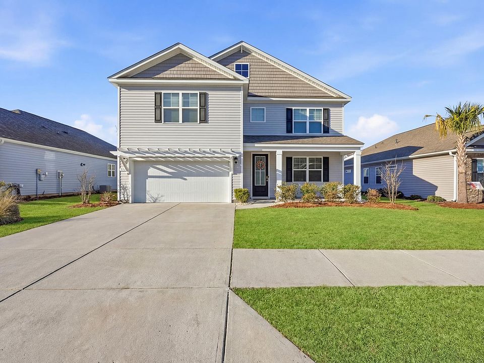 Welcome to 115 Juniata Loop in the Hidden Brooke community. This traditional style former model home offers 5 bedrooms and 3.5 baths with a flexible layout and plenty of space. The main level features wide-plank laminate flooring and a spacious kitchen with 42" cabinets, granite countertops, subway tile backsplash, stainless appliances with gas range, island, pantry, and breakfast bar. First-floor primary suite includes a walk-in closet and ensuite with double vanity and tiled shower. Upstairs you’ll find four additional bedrooms, two full baths, a laundry room, and a large loft. Enjoy both front porch and screened back porch, plus a fenced backyard. Additional highlights include gas HVAC and water heater, updated carpet, and tile in wet areas. Hidden Brooke offers a community pool, clubhouse, fitness room, and trash service through the HOA. Conveniently located about 10 minutes from Cherry Grove Beach. Schedule your showing today!