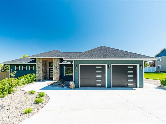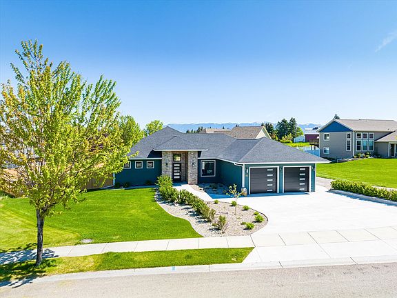 This beautiful custom 4BR, 2BA, contemporary, well-designed home offers 2110sf of single-level living on a large .44 ac lot. Recessed lighting, 9' ceilings and 12' in the living room. Great floorplan with large Anderson windows and deluxe window coverings. You'll enjoy the spacious primary bedroom with patio access, an oversized walk-in closet, and a fully tiled walk-in shower. The fabulous kitchen features high-end Bosch stainless appliances, gas range, a 7' breakfast bar, Quatrz countertops, custom tile and cabinetry. Gas fireplace, large laundry room w/sink and cabinets. Double car finished 24 x 24 garage with mandoor. Nicely landscaped, underground sprinklers, poured concrete pad ready for your shed, premium vinyl fencing, and even extra parking for boat or RV through the double gates to side-yard! Call Romy (406)250-2502 or your real estate professional.
