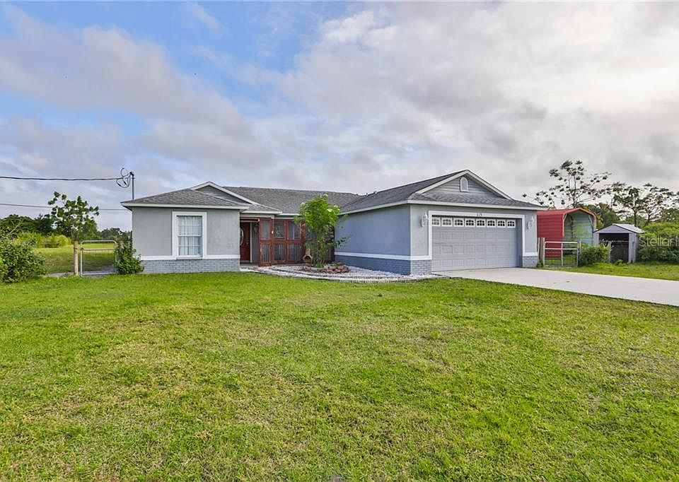 Quiet Country Setting! Beautifully maintained 3 bedrooms 2 bath block home located on a fenced 1.07 lot with limitless potential. The screened front porch welcomes you into the spacious family room with volume ceilings and double French doors that opens to the oversized backyard. Wonderful bar kitchen features: full appliance package-refrigerator 2019, double sinks and a serve thru window perfect for entertaining. Split floor plan features a master bedroom with garden tub, dual vanities and large walk in closet. This property allows for boat or RV storage with a 14x21 medal barn in the backyard.