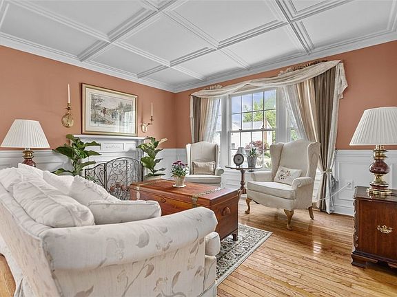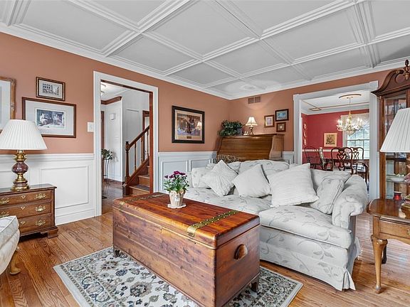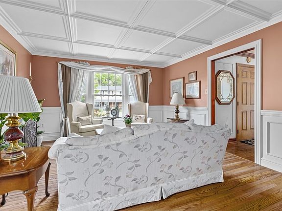 Move in condition home with lots to offer. Living room with coffered ceiling, real oak floor, lots of natural light and exquisite woodwork. Dining room with woodwork design on the ceiling, crown molding and oak floor. Kitchen with oak cabinets with new handles, crown molding, eating area and sliding door that leads to a fantastic large 12x20 back porch. Additional 12x12 patio. Family room with woodburning fireplace and fresh paint. 1st floor powder room. Master bedroom with cathedral ceiling, private bath and walk-in closet. 2nd bedroom also has a walk-in closet. Lots of fine woodwork, stamped concrete and beautiful landscaping. Finished lower level providing approximately 380 additional square feet of living space. Storage room with shelving. Marvin front door and sliding back door. Furnace and Central Air installed in 2022.