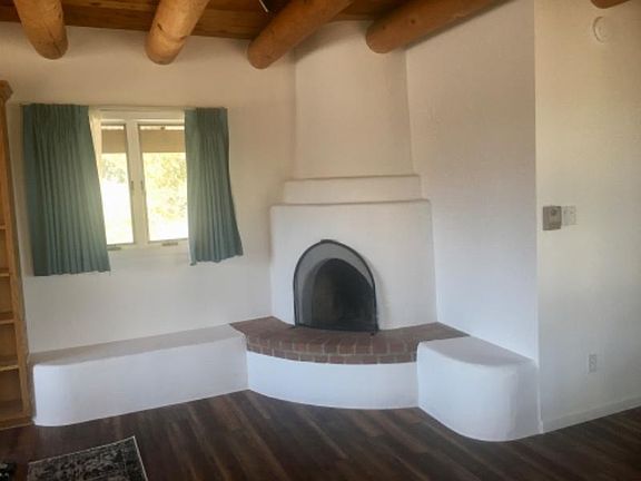 Property Id: 230724 Private furnished residence on over 2 acres with views of Sangre de Christo mountains. A spacious one bedroom w/ walk-in closet and kiva fireplace. Large living room with a second kiva fireplace, beam ceilings, and architectural floor to ceiling windows allowing ample natural light and private views of pine forest and mountains. Brand new L Section sofa/futon in grey and new high end wood flooring throughout (except bedroom is brick). Own entrances (front/back/side) with the main one through fenced courtyard with large fountain feature. Sliding glass door to exclusive open yard with beautiful pine tree grove and views. Washer/dryer in spacious closet with linen shelves. Ample parking on site. 5-7 min to East gate LANL. Dog(s) welcome w/ $500 deposit. $100 due towards utilities/internet. Parking on Site.