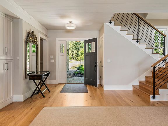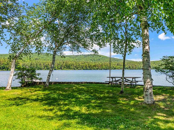 This custom contemporary home, built in 2018, is designed to seamlessly integrate with the stunning beauty of the glistening waters of Class-A Pleasant Lake. Situated on a unique level point of land, the property boasts 148 feet of shoreline, two private beaches, a lush lawn, a deep water dock, and commanding views of Mt. Kearsarge. The foyer opens to a great room with captivating lake vistas in all directions. The chef-quality kitchen features top-of-the-line appliances and transitions easily to an adjacent four-season sunroom with a wood-burning fireplace. An open porch off the great room has a descending screen, allowing for open doors all summer. The first-floor primary bedroom and luxurious bath face the water. Upstairs, an inviting media room with a lakefront balcony awaits. Three corner bedrooms offer en-suite or adjacent baths. A 270 sq. ft. dressing room provides luxurious storage for clothing. Retreat to your private restorative yoga studio. Meandering native stone walkways framed by a symphony of border gardens lead to an outdoor shower, a Zen garden, or the lake. Enjoy breakfast on the sunny-side patio or indulge your green thumb with the established raised bed gardens. The property includes a one-car attached garage and a separate two-car garage with storage above. Pleasant Lake is a quieter, residential lake reaching depths of up to 100 feet. Plan to journey by boat to Blueberry Island or Elkins for Sunday band concerts. Enjoy water skiing, tubing & sailing!