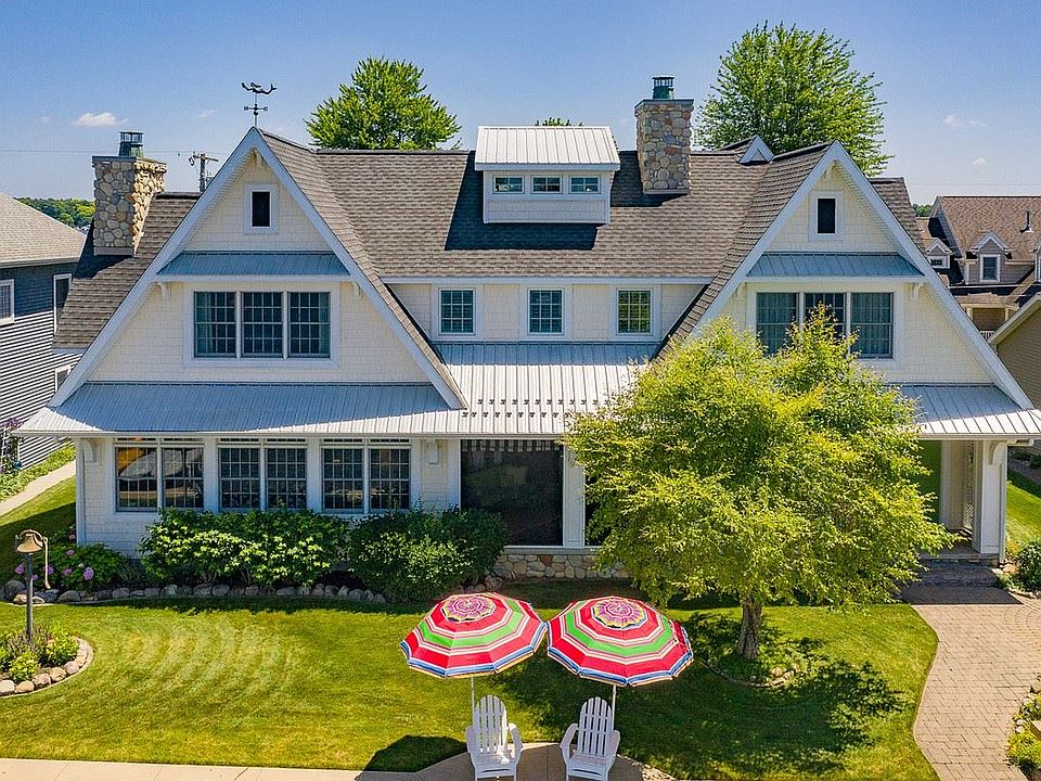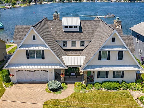This custom built Lake George home is a work of art! 79.76 Ft of lakefront with a concrete seawall, sandy beach, maintenance free vinyl pier with platform and gorgeous sunset views! This home is picture perfect with a great floor plan! The quality and craftsmanship are apparent! Open concept great room, kitchen and dining area with wonderful lake views. A floor to ceiling stone, wood burning fireplace with insert & heatilator. Custom kitchen with island breakfast bar, granite counter tops, stainless appliances, pot filler, walk in pantry and farm sink. The great room and dining room give access to the 3 season screen porch. The porch has another stone fireplace and a customized built-in gas grill. White washed pine ceilings throughout the home with transom windows above all the interior doors. The upper level master suite is lakeside with a large master bathroom and his and her walk-in closets. This home has a total of 5 bedrooms, 4 are en-suites, a third level bunk room and 4 full bathrooms. The main level bedroom is currently used as a den. Landscaped with irrigation, turf pavers are installed roadside to allow parking for six vehicles. See the feature sheet in associated documents for more details! Go to: https://youtu.be/0uq3uMubgzo for a video tour of the exterior of this property.