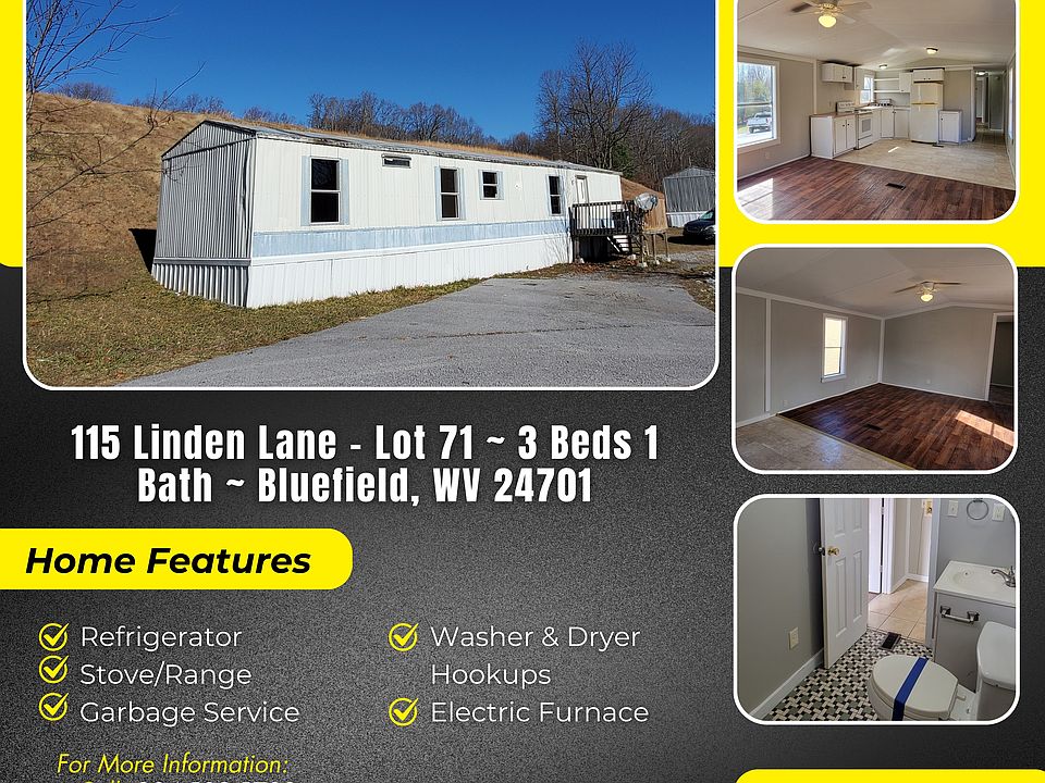 115 Linden Lane Lot 71 ~ 3 Beds 1 Bath ~ Bluefield, WV 24701 LEASE OPTION (Path to Home Ownership): Initial payment: $1,500 with no payments due until the 1st of the following month! Monthly payment: $695/month. Trash & lot rent are included. or RENTAL: Security Deposit: $695. Can be made in payments if needed. Monthly payment: $695/month. Trash & lot rent are included. Sorry, this home is not HUD approved. 3 bedroom, 1 bathroom singlewide mobile home for rent or Path to Home Ownership located at The Oaks MHP behind the Brushfork Armory in Brushfork, WV. Electric furnace. New paint and flooring throughout the home. Separate laundry area with washer and dryer hookup. Located at the entrance of the mobile home community on a corner lot with only one neighbor to the side of the home and no other neighbors. Community has a basketball court and bus shed, on-site snow removal, 24 hour on-site management & full time maintenance staff. Paved roads and paved driveway. Quiet family community with large spacious lots, great view, all underground utilities, & monthly gift card drawings. Furnished with stove and refrigerator. Mail box on site for easy daily mail delivery. Move in today! Christian Management Corporation Office Hours: Mon-Fri 9:00AM-5:00PM & 10:00AM-2:00PM the 1st Saturday of every month You can view THIS property 7 days a week! Most pets welcome with a $300.00 pet fee per pet and signed pet agreement. Maximum 2 pets. No aggressive breeds due to insurance restrictions. Clean, safe, quiet, crime & drug-free are our priorities for our residents! We support Equal-Housing Opportunities! Good people with good, bad, low, or no credit but stable employment or Social Security are welcome. -MUST pass background check -NO evictions in the last 7 years -NO sex offenders Is this property not what you are looking for? View our other available #homes, #mobilehomes, #apartments, and more on our Facebook or our website!