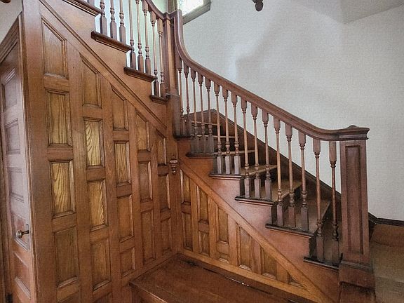 The welcoming wraparound front porch will be your entrance way through the towering front door. The foyer highlights the stunning wood staircase, a stained glass window, sitting bench with hidden storage and coat closet.