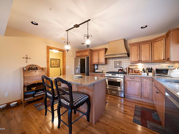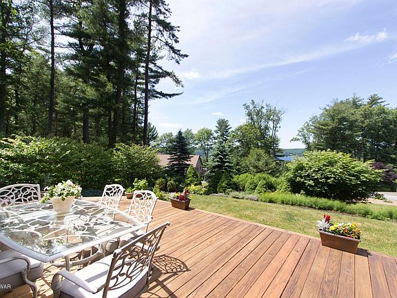 Lake Wallenpaupack Lake Views, Lakerights and Boatslip located in the prestigious community of Whispering Pines! This stunning home offers 3 bedrooms plus loft, 2 1/2 baths (all recently renovated!), main level master suite that walks out on to the deck, open & flowing floor plan, living room with soaring ceilings & floor to ceiling stone fireplace, modern kitchen overlooking the dining area and sunroom. Spacious deck, paved driveway, attached 2 car garage and impeccably landscaped. Situated in one of the nicest communities at the lake!