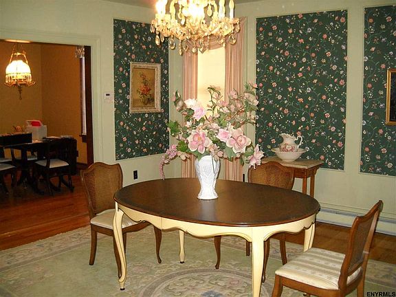 HOME,GARAGE,IMPRESSIVE SETTING, 1.8 ACRES...A stupendous home, hardwood floors, most windows replaced, recent roof and siding, gas fired four zone hot water heat, 200 AMP electric box, plus another in the garage, king size man cave with wood stove. Magnificent semi-country location, sweeping lawn, long road frontage, good separation from neighbors yet not desolate. Interior totally remodeled about thirty-five years ago yet the exterior design dates from the Revolutionary War era. Taxes with basic STAR.