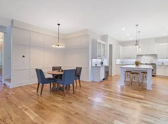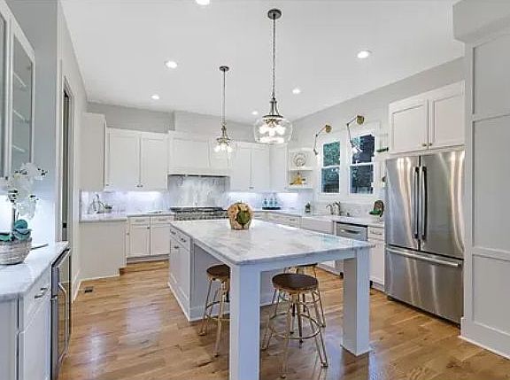 - Kitchen Features: Cabinets White, Breakfast Bar, Stone Counters, View to Family Room, Kitchen Island