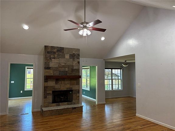 Step inside to a welcoming foyer that opens into a formal dining room, perfect for entertaining. The spacious great room features a vaulted ceiling and a stunning stone fireplace with natural gas logs—an ideal spot to gather and relax.