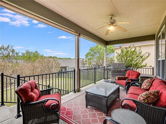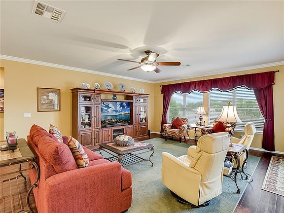 Rich, waterproof vinyl plank flooring and bold colors welcome you to this updated Pemberton Hall/Cumberland with a panoramic view looking out to the Texas hill country. The elevation of the covered patio with panoramic view and gentle breezes provides a great space for relaxing or entertaining. Spacious living area with three bedrooms plus study offers space to accommodate your lifestyle. The kitchen features granite, stainless appliances, updated light fixtures, center island, and abundant storage, plus there is a convenient butler's pantry adjacent. A powder room off the living area is great when entertaining and a jack & jill bath between secondary bedrooms provides privacy for guests. Separate laundry room with sink and custom cabinets above offers offers additional storage. Built in storage and workbench in the garage round out the convenience of this special home. No steps to garage or front door entrances. Great opportunity for enjoying the Sun City lifestyle!