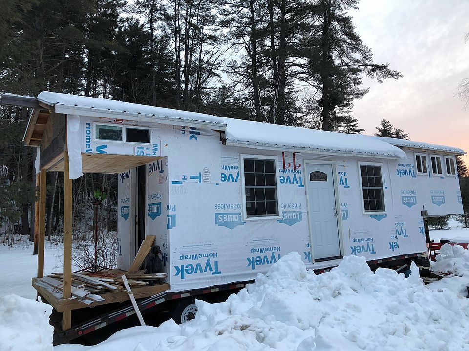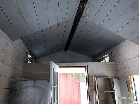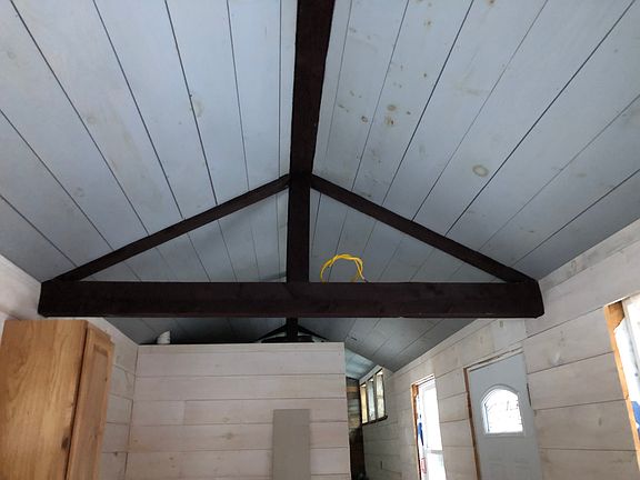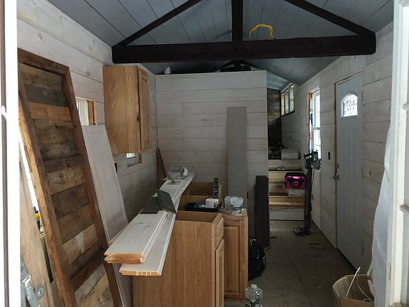 Personalize and make your tiny home dreams come true. Open space with many windows to let in the light, white-washed walls, and cathedral ceilings. Lots of areas for storage, including drawers built into the stairs to the bedroom. Personalize the home with your own siding and light fixtures. Bamboo floating floor (included) needs to be finished in the main part of the house, but is done in the loft and bedroom. Trim work around the windows and doors needs to be finished and fixtures need to be hooked up. Fixtures/appliances include washer/dryer unit, refrigerator, stovetop, kitchen cabinets, vanity perfectly sized for the bathroom, ceiling fan/light, and more. With 314 sq feet and cathedral ceilings, this house is more of a tiny mansion on wheels.