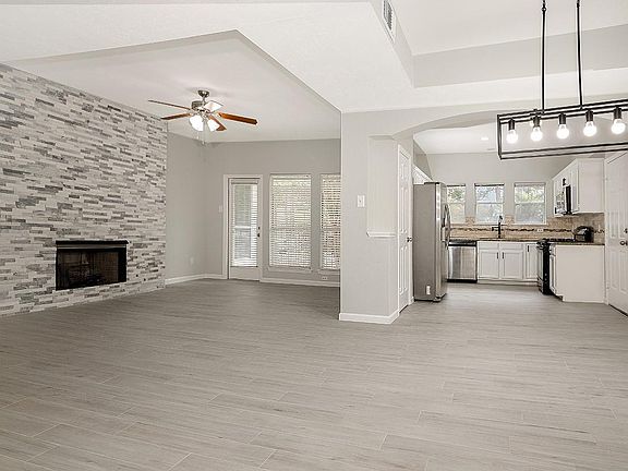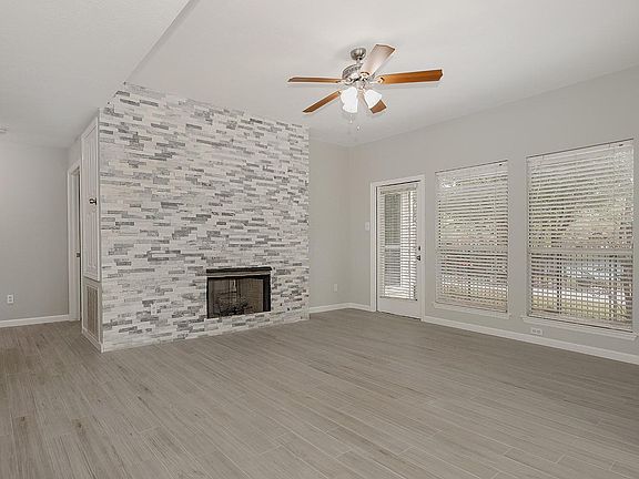 Beautifully remodeled one story townhome for lease in Panther Creek! Fresh neutral paint palette in today's colors, new light oak wood flooring, abundant windows, designer light fixtures and a nice, open concept. The family room with floor to ceiling stacked stone fireplace opens to the sunny breakfast room and kitchen, with stainless steel appliances (fridge included), granite counters and gas cooking. Two bedrooms with two full baths; covered patio in the fenced yard with nearby pond and walking trails. Two car garage; area pool too! Equal deposit; current credit report with scores required; pets on case-by-case basis.