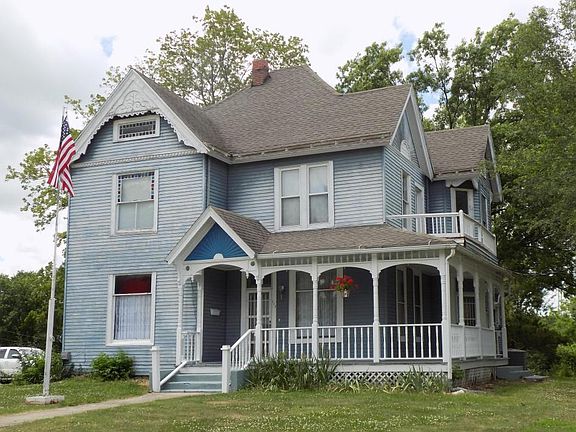 Very spacious 4 bed/2 bath Victorian home on 3.87 acres. Beautiful original woodwork! Ornate staircase, stained glass windows, 2 sets of pocket doors, wrap-around covered porch. All new carpet. Kitchen cabinets have been antiqued. Sun porch & balcony off master bedroom. Large bathroom downstairs. Antique soaking tub in upstairs bath. Well insulated, large attic, natural sunlight, metal siding.