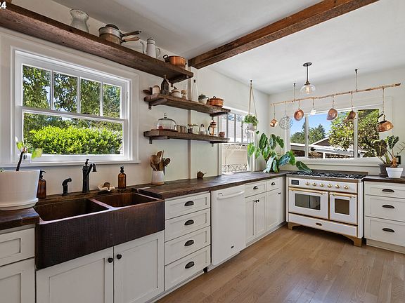 Urban garden cottage as seen in the pages of Nester Magazine, Sunset Magazine, & the cover of Everyone's Table: Global Recipes for Modern Health by Gregory Gourdet! The home is set back off the street behind a flourishing garden that explodes with peonies, lilacs, rhododendrons, wisteria, roses, clematis, and daffodils. Enjoy delicious fruit from apple, cherry, and pear trees. Inside, you'll fall in love with the large storybook fireplace featuring new stone surround for comforting evenings. Large windows provide a bright and airy feel year-round. A wide arched doorway leads to the spacious formal dining room. Completely updated kitchen maintains a touch of whimsy with rich butcher block counters, new cabinets, appliances, open shelving, and oak flooring. Large original bathroom on the main level with lovely vintage tile and archway into the shower. Worries melt away upstairs in the incredible primary suite where the bathroom feels like a woodsy spa with new clawfoot soaking tub, stylish shower, and double vanity. Primary bedroom is a private sanctuary with vaulted ceilings, skylights, and ample storage. Another bedroom on the main level has its own door out to the yard. There's a large third bedroom with fresh carpet and paint in the partially finished basement which also offers laundry and lots of storage. Back outside, the deck off the kitchen is a private oasis with built-in bench seating. Detached garage, RV parking, chicken coop, and more! Covetable proximity to both nature, entertainment, and delicious food. Near Downtown Gresham, food carts, and Max Blue Line, plus McMenamins Edgefield is just 10 minutes away!