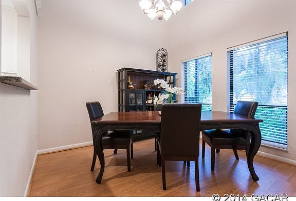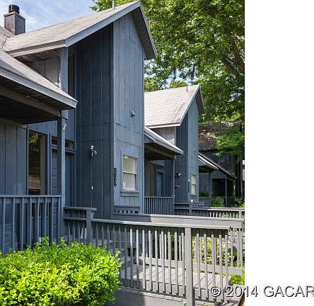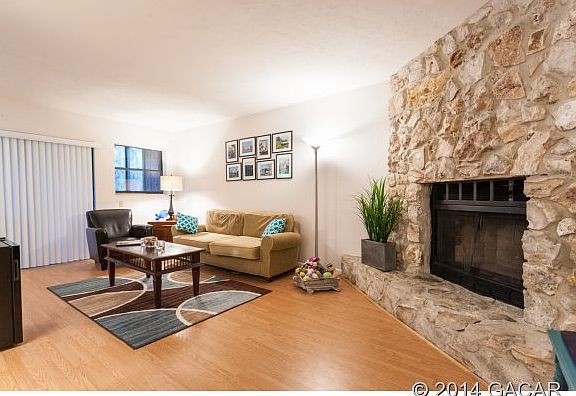 Beautifully updated 2 bedroom, 2 bathroom townhouse located less than 2 miles to the University of Florida! New tile installed less than 2 months ago. Kitchen with new cabinets and granite counter tops installed in 2012. Great floor plan with 1 bathroom and bedroom downstairs with sliding glass door that leads to wood deck. Living room with large stone fireplace and sliding door that leads to large screened porch. Formal dining room with soaring ceiling and windows. Upstairs loft makes for a great office space. Spacious upstairs master bedroom with wood deck and master bath with new vanity and tub installed within last 6 months. Huge laundry room and plenty of storage space throughout! All interior doors replaced in 2012. 1 year home warranty included.