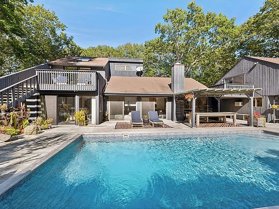 Nestled in a quiet neighborhood and just one block from Peconic Bay beaches, this recently updated, designer finished 3,203 +/- sqft. residence is thoughtfully designed for both entertaining and everyday living. Set on 1.06 +/- beautifully landscaped acres, this 3 bedroom, 3.5 baths oasis ensures comfort and privacy. The main level features a spacious double-height foyer leading to light-filled, cathedral-ceiling living and dining areas with access to the adjacent outdoor covered deck, an open kitchen with breakfast eat-in area, all looking out through walls of glass doors to the luxurious yard, creating seamless indoor/outdoor living. The main floor also offers two bedrooms sharing a full bath, one with private access to the screened porch, a laundry room, a powder room, and access to the attached garage, artist studio/cabana/pool house own full bath. Upstairs offers an oversized primary en-suite bedroom with a spacious walk-in closet, sitting area and a private balcony with stairs leading to the pool area. Completing the upstairs is an exercise room and ample storage space. Outdoor living shines with the 31x15 in ground pool, jacuzzi and ample deck and patio spaces perfect for outdoor gatherings. Conveniently located minutes away from the marina, bay and ocean beaches, waterfront restaurants, and local shops, 115 Newtown Rd offers an exquisite blend of timeless elegance and modern comfort
