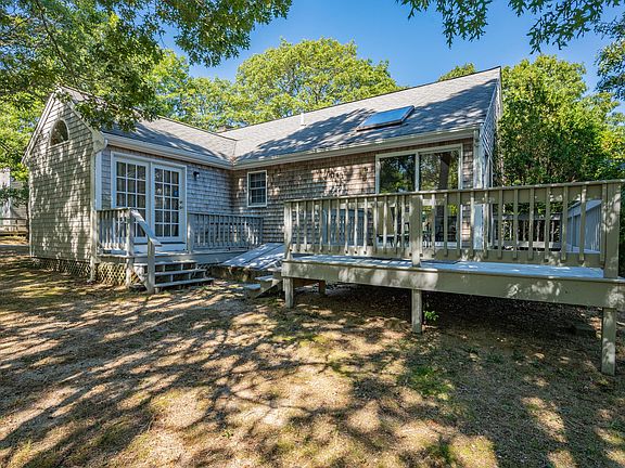 Superbly situated less than a ten-minute drive to historic downtown Hyannis, multiple beaches, and the ferry, this picturesque 3 bed 2 bath 1200+ sqft home is nestled in a verdant plot easily enjoyed from a fully screened front porch brimming with rustic charm. Step into the breathtaking living room with soaring ceilings highlighting stunning exposed beams, fabulous skylights, and windows drenching the space in natural light with a gorgeous brick fireplace prominently placed. Warm hardwood floors lead to a vast kitchen with abundant counter space, an island, and natural hardwood cabinetry. Sunlight pours through dual skylights, wood-framed windows, and french doors leading to a beautiful deck, in the dazzling Sunroom. Bedrooms are spacious and airy, with the primary suite boasting dual glass sliding doors onto a personal deck overseeing a wooded backyard. The home also includes a one-car garage and a partially finished basement. Be enchanted by this charming home, come view it today!