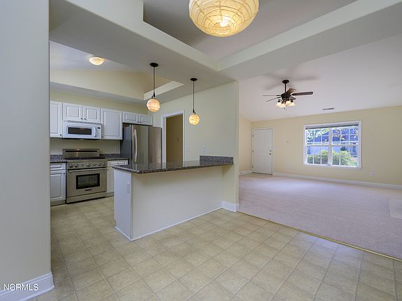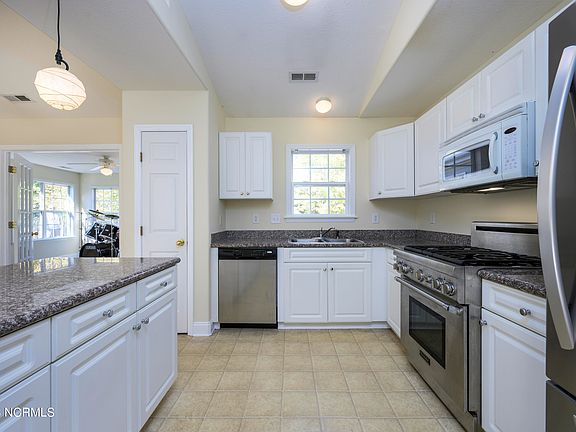 A rocking chair front porch welcomes you to this well-maintained one-story home perfectly situated with a nature backed yard, just minutes from the heart of New Bern. Conveniently park your car in the attached two car garage. Enter to the living room where you find new carpet, a tall vaulted ceiling and a cozy natural gas log fireplace. Easily entertain from the kitchen finished with granite countertops and stainless steel refrigerator, dishwater and Thermador range. Pass through the dining area into the sunroom perfect for relaxing with a favorite read or activity. Head out to the fenced-in backyard where you can host cookouts with friends on the patio. The first floor primary bedroom offers a walk-in closet and an en suite bathroom with granite countertop. Two spare bedrooms allow for an in-home office and guest space. Enjoy being minutes from medical facilities, local establishments and Historic Downtown New Bern. Contact us today for your private showing!