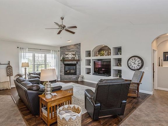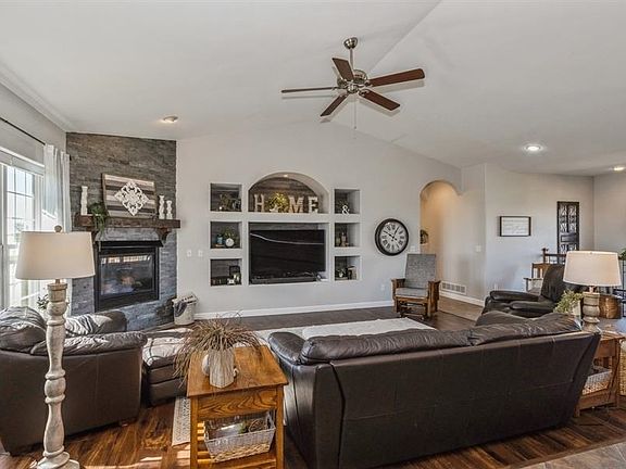 Great value! Beautifully updated large ranch home on 1.80 acres. Open floor plan. Living room has new flooring, built-ins, & stone gas fireplace. New appliances, quartz countertops and backsplash in kitchen. Large primary bedroom with stunning tile shower(2024), walk-in closet, 2 sinks, granite tops and soak tub. Separate dining space has sliding door to large 2 tiered deck(2018), grill area, hot tub, 12x20 shed, mature landscaping, and fenced yard. Main floor laundry mudroom sink, custom cabinets and butcher block top. All appliances stay including washer/dryer. Full basement finished in 2021 complete with electric fireplace, kitchen area, & tons of storage. City water, private septic. Assoc. fee covers road repairs/snow removal, street lamps, insurance fees, & lawn mowing of common areas. Roof/gutters 2024.