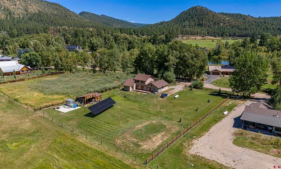 Country living close to town! This charming two story 3 bedroom 2.5 bath home plus an office and a family room is located on a one-acre lot with a creek running through the front of the property. The subdivision borders Pine River, providing year-round live water and the opportunity to enjoy fishing right outside your doorstep. The open concept living-kitchen-dining area is great for entertaining and gatherings, with French doors opening from the dining area to the back deck. The kitchen has stainless steel appliances and tile countertops. The living room has a freestanding wood-burning fireplace and views of the pond. The spacious primary bedroom is located on the main level and has private entrances to the front covered porch and back deck. The main level also has an office and a laundry area. The second floor features two additional good size bedrooms with a full bath and a family room. This well cared home has had many recent upgrades, including solar panels, a property fence, a large cement slab by the barn, a water treatment system, landscaping, and some window shades. There is also a small barn, a tack room, and a storage. Wildlife enthusiasts can enjoy watching elk, turkeys, various birds, occasional bears, and deer roaming past the subdivision. This property would make a fantastic primary home or a second home.
