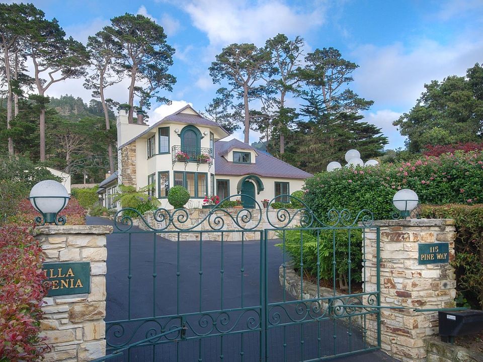 PRICE REDUCED $200,000+ Rebuilt 1927 European Style Chateau "Villa Eugenia" is gated with dramatic Ocean Views in a park like setting. Wonderful, livable quality throughout. Completely new kitchen & baths. Limestone, Marble, Quartzite & Hardwood materials. Wolf, Sub Zero & Miele appliances. Copper shingle roof, double paned windows, outdoor stone patio courtyard with built-in barbecue, refrigerator and hot tub. Two fireplaces, wine room & so much more.....Top this all off with a detached guest quarter over a 2 car garage & a bocce ball court surrounded by gardens.