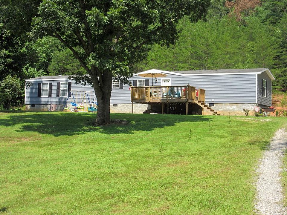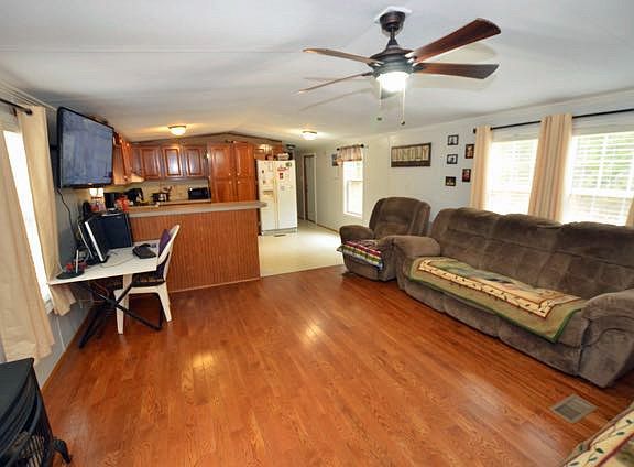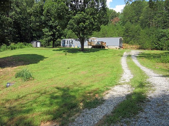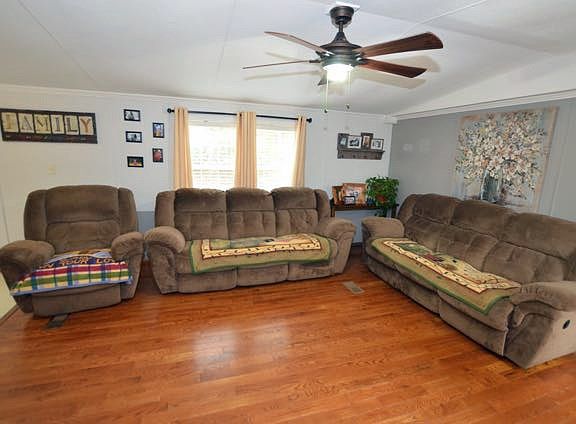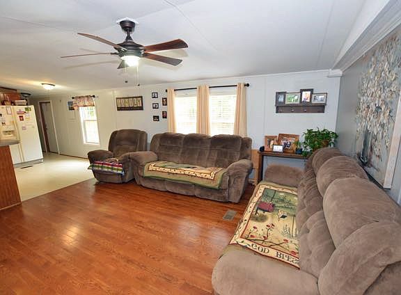Immaculate 2002 oversized (16x76) single wide mobile home on 6.93 secluded acres. Many upgrades including new exterior vinyl siding and shutters in 2018, heat pump replaced in 2017, oak hardwood flooring recently installed in the living room, hall, and bedrooms. Both bathrooms have tile floors. Master bath beautifully remodeled. New front porch/deck. The water line from the pump to the home replaced and a new water pressure tank was added in 2018. The living area and master have vaulted ceilings. Large utility room with easy access from the living area and the master bedroom. The crown molding has been upgraded throughout. Propane heater in the living room and a fenced area in the back yard for dogs. New light fixtures throughout . Nice poured concrete sidewalk and 2 septic systems.