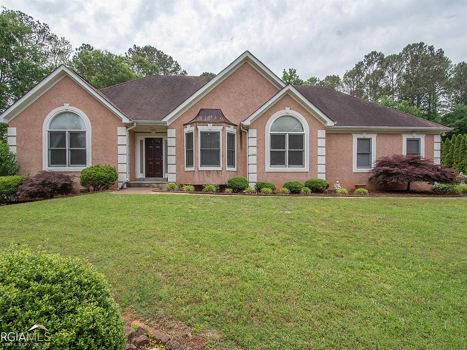 Welcome to this beautiful ranch home on a full partially finished basement located in the serene Mosby Woods Lake Community with protective covenants and easy access to I-85! Situated within a private and large culdesac lot, this home offers a peaceful setting and beautiful landscaped yard. The main level is spacious and includes a bonus sunroom with amazing natural light and see-through fireplace. Perfect space for an art studio or a second living room! Kitchen includes stainless steel appliances and a gas range. Laundry room is located off of kitchen that leads to stairs that take you to floored storage in the attic. The oversized partially finished basement has a full kitchen, bathroom and laundry area. Perfect space for a workshop, a private office area with access to a patio and a fenced private yard. This home is conveniently located near shopping, dining and entertainment. Don't miss out on this one! (This home is being sold As-Is.)