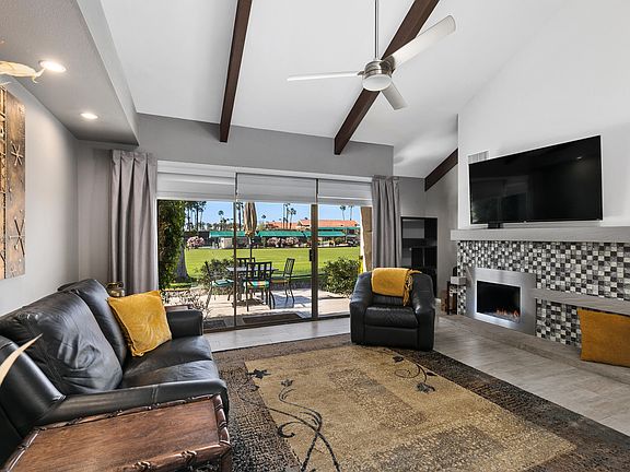 You will fall in love with this masterfully remodeled and professionally decorated condo in beautiful Mission Hills Country Club. Turnkey Furnished! The spacious modern open floor plan highlights the quality and design of materials used throughout. The kitchen's bold and plentiful cabinets accentuate the wide quartz waterfall design counters and the breakfast bar opening into living room. Appliances are all stainless steel, including the washer and dryer. Beautiful neutral ceramic flooring flows throughout the condo. Relax in the open high-beamed ceiling living room. Perhaps watch the large TV mounted above the contemporary gas fireplace or enjoy the view from the windows and sliding doors going out to the back patio. The perfectly manicured grounds and the majestic San Jacinto mountains offer beauty near and far. This condo is ideal for parties and guests. The master bedroom features a fireplace, wall mounted TV, en suite bath with custom cabinets, redesigned shower, and walk-in closet with shelving. The guest bedroom also includes an en suite bath, walk-in closet, TV, and slider to the patio. There is a community pool/spa just across the street plus many additional community amenities (with membership) including golf, tennis, fitness center, clubhouse w/banquet facilities, pickle ball, bocci ball, & croquet. Desert community offerings include golf, night life, incredible dining, shopping, casinos, and nearby PS International Airport.