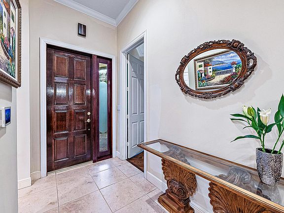Welcome home to this rare gem! This single-story villa, nestled in a tranquil gated enclave of only 15 homes, offers a 3/3 layout (2 master suites + office w/ en suite baths) & 2-car garage. The screened-in pool w/ waterfall & spa is visible from all living areas, creating a serene atmosphere. Gourmet kitchen boasts 42'' wood cabinets, under-cabinet lighting, new dishwasher & microwave. Special features include SOARING 12' ceilings, 8' doors, Toto toilets, Aqualink remote pool/spa control, electric shades, UV light on AC, full-house water treatment system, new garage doors, spacious laundry room, new water heater, & wood floors in bedrooms. Surrounded by lush landscaping, you're just steps from the intracoastal & a short drive to shopping, restaurants, beaches, golf & PBI