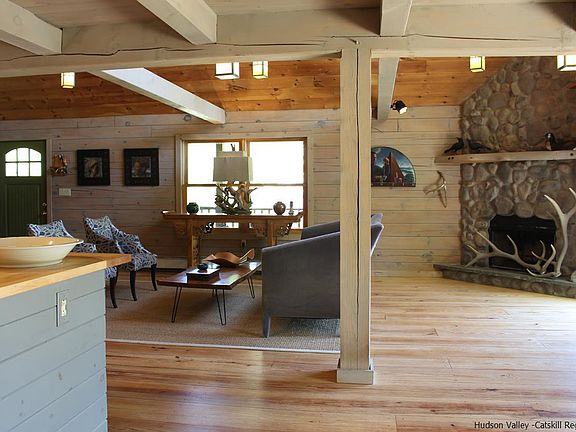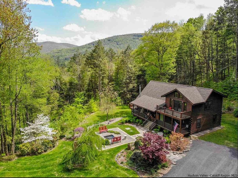 DISTINCTIVE SECLUSION with EXPANSIVE VIEWS This 3548 SF Magnificent Log Cabin rests on 9.6 private sun drenched wooded and open acres. Classic Log Cabin exterior with a super light filled contemporary interior features 3 BRs, 3 BAs, SUPER CHEFS kitchen with 2 Bosch Dishwashers , 2 Jenn-Air convection wall stoves, professional Jenn-Air 6 burner cook top with griddle and hood and side by side refrigerator and a wine cooler, all in easy to maintain S.S. All baths have been designer updated as well as lighting fixtures. Unusual Rustic hand crafted stone corner wood burning F.P. in LR. Sliders to massive open deck with smaller covered deck at front entrance. A sweet private deck off Master Suite as well. Open loft on 2nd level overlooking main LR. Completely finished walk out basement with full ceiling to floor windows and sliders features full laundry room, full Jacuzzi bath, utility room, spare room and huge open space for anything you could imagine. Closets all throughout house including a large walk in closet/dressing room in master suite. Exotic rare perennials and mature plantings to delight the soul. Meditation reflection pond with Mt views for those Zen moments we all need.