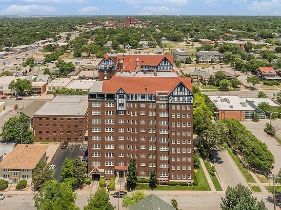 Rare 10th floor opportunity with sweeping views of the College Hill area. Fresh and beautiful, this condo welcomes your style and decorative appointments. Carpet in the bedrooms, wood floors in the common areas. Newer wood windows, fresh paint , newer TRANE A/C . Refrigerator, microwave and stove stay along with 2 dining room furniture pieces and 2 area rugs. Step out of your apartment and be welcomed by gorgeous views of the western sky and downtown Wichita compliments of the Sky room; perfect for enjoying morning coffee or an evening cocktail. Main floor lobby fireplace has a lovely ambiance including several lounge areas. As an owner you own shares of the building. This apartment is 94 shares with a monthly HOA fee of $1,233.The dues cover exterior maintenance and insurance; 24 hour security; basic utilities and property taxes. Covered Parking, if available, is an additional $90 per month. Valet parking. Additionally package /grocery delivery to your door. Work out room and laundry in the shared basement accessible to co-op unit owners. The Sky room is available for entertaining and is located on the top floor. It has beautiful views of the city and is appointed with a full kitchen.No pets. There is also a guest room that owners can reserve for houseguests. Building roof was replaced in 2008, covered by HOA dues. Seller has paid upfront for capital improvements: $7,175 (includes new boiler, new smoke stack.)