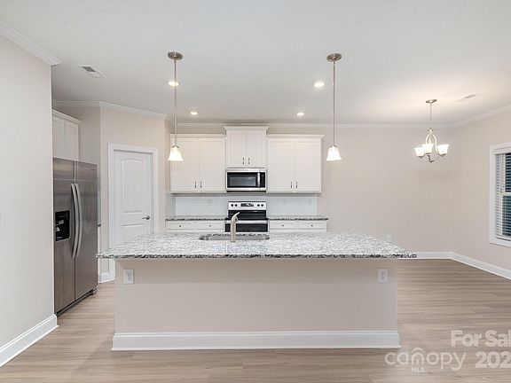 Like new and built in 2023, this beautiful home is designed to offer both comfort and style. As you step inside, you'll find a versatile room with French doors, ideal as a home office, playroom, or even a 5th bedroom to suit your needs. The heart of the home is the expansive, open-concept living space that seamlessly connects the living room, dining area, and stunning kitchen. Complete with granite countertops, an oversized island, and modern appliances, the kitchen is perfect for everyday living and entertaining guests. A convenient half bath completes the main level. Upstairs, the spacious primary bedroom features a vaulted ceiling and an ensuite with a soaking tub and separate tiled shower, creating a private retreat. Three additional bedrooms, a full bathroom, and a laundry room offer ample space for family or guests. Outside find a patio and serene wooded views. Located just minutes from downtown Troutman, this home offers modern living in a convenient location!