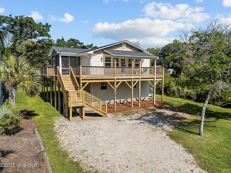 Fantastic location just steps from a beach access! Hard to beat the convenience of the location and its direct access! This 3-bedroom, 2-bath single-family home offers a reverse floor plan with all bedrooms on the ground level and a spacious open-concept living, dining, and kitchen area upstairs. Luxury vinyl plank flooring runs throughout the home, providing style and durability for easy beach living. Expansive wrap around decks offer plenty of room for outdoor entertaining, relaxing in the sun, or enjoying shade. There are both covered and screened in portions! Additional features include an outdoor shower and ample space for beach gear with an exterior shed.