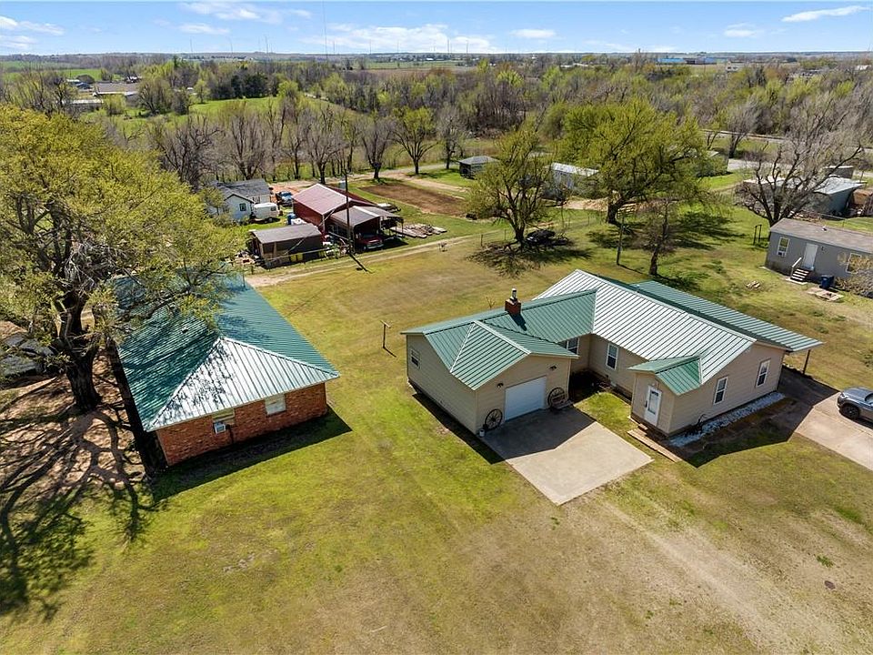 peacefulness that comes with living outside the city. This home sits on just under an acre with an extra home that has been converted to a shop. The shop has been used as a mechanic shop and just recently as a marijuana grow. Recent updates to the home include new water lines (2020), heat and air (2020), new roof on the shop (2020), flooring (2023), cabinets (2023) and updated bathrooms (2020). Options for the shop are bountiful. There is no zoning according to the city of Minco so this home can be considered commercial property.