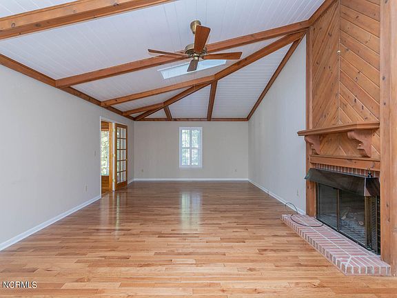 This distinctive rustic charmer on a corner lot in a great Pinehurst neighborhood offers a wonderful design with room to roam, all on one level! It has hardwood floors throughout the main living areas, parquet floors in the bedrooms and tiled bathrooms. A spacious living/dining room has a vaulted white board ceiling with exposed knotty pine beams, brick fireplace with hearth and knotty pine surround. Two glass doors on each end open to a large Carolina room across the back with window walls, parquet floor and ceiling fan. That makes this home perfect for entertaining! The kitchen has French door access from the dining area and a hall, white wood cabinetry, white appliances, and quaint breakfast nook. It has a drive-through garage with access from both streets. It is on a beautiful, all-natural lot with mature landscaping. You are just minutes from the heart of the Village of Pinehurst, shopping, dining, and Lake Pinehurst.