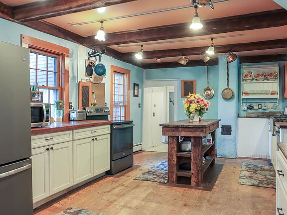 Offers due by Noon Monday September 13th. Sellers request no showings until they can review offers. Privacy, Charm and Character abound in this 1783 Antique Cape, built for the Reuben Gile Family. Kitchen and baths have been updated in period decor, as has electric (200 amp circuit breakers), plumbing and metal forever roof. This home sits at the end of a well maintained dirt road and includes a recent detached 2 car garage, as well as a 3 story barn with metal roof moved from NC to the site 42 years ago. Barn has water and electric. Floors in home are soft pine and walls are a combination of repurposed barn wood and knotty pine, and some plaster. This is truly a must see. Kitchen counters are stenciled wood and farmers sink is soapstone. Beams, soaring ceilings, large airy rooms, something unexpected around every corner! House is heated by an oil furnace and an exterior pellet furnace...both hooked in to baseboard hot water heat throughout both floors. Additionally there is a stunning hearth with a woodstove insert for ambience. Huge storage closets throughout. Seller generously providing a Home Warranty for peace of mind.