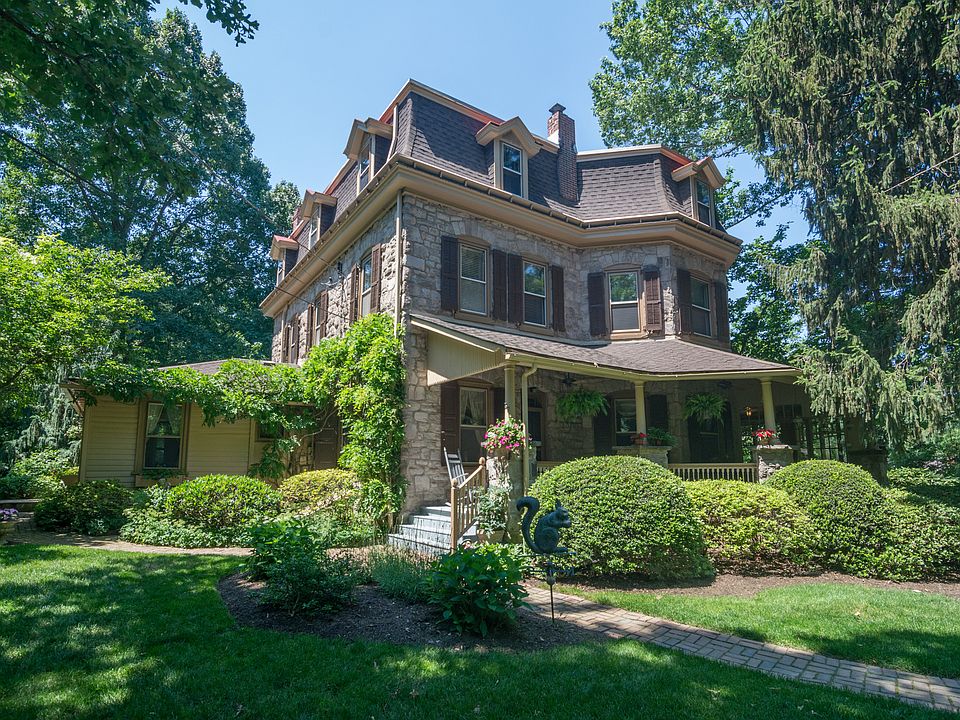 A long tree lined private lane leads to this magnificent stately stone Victorian Manor. Lovingly renovated, this magnificent home is tucked in a private serene setting with walking trails, lush gardens, and Queen Anne partially enclosed wrap porch entry. Blending the stunning architecture with nature offers this majestical setting. This wonderfully appointed home features exciting 12 ft ceilings on the first floor, intricate detailed mill work throughout, updated Kitchen, master bath & hall bath. The warmth & elegance of the living room is accented with a carved coffered ceiling, wainscoting and a wood mantled fireplace. The family room has Victorian style pocket doors leading to a magnificent Formal Dining Room presenting coffered ceiling accented with a medallion center piece, wood floors and french doors. The completely renovated granite center island kitchen,a cook's delight, with 4 burner gas cooking, pantry, wood floors & flows to the sunny windowed morning/ breakfast room. The Breakfast room overlooks the pond with a water fall,large in ground pool, entry to the porte-co-chere and the picturesque setting. Off the kitchen there is a butlers pantry/ mudroom, powder room and den/office or possible in-law suite with private entry. The second floor features high ceilings, charming master bedroom suite with windowed alcove,spectacular views,walk - in closet & renovated en suite bath with shower, claw foot tub & double sink. Two additional bright and airy bedrooms are on this floor with updated hall bath. Step up through the french door entry to the summer sleeping porch that offers views of the picturesque setting. Third floor provides 2 adorable bedrooms, full bath, large utility / storage room and walk up entry to the railed widows walk PLUS there is a Billiard Room on this floor. There is high velocity central air,2008 roof and a 3 car detached garage. One year HSA Home Warranty. Conveniently located to the Pa TP, train and downtown Ambler's shoppes, restaurants and theater. Blue ribbon Upper Dublin Schools