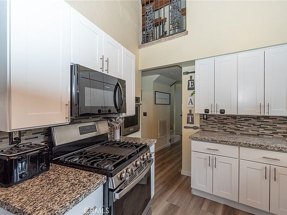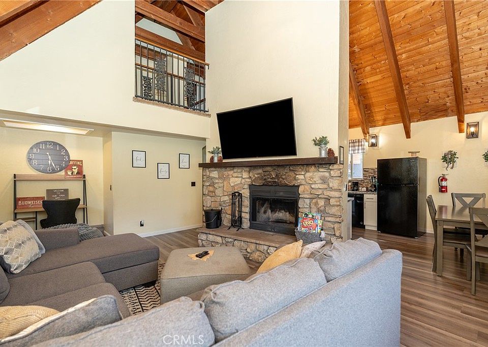Classic stone fireplaceModern finishesSleek cabinetryWarm and inviting floorplanAmple counter spaceRemodeled kitchen