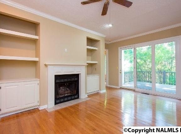 - LIVING ROOM DESC: 9? Ceiling, Fireplace, Crown Mold, Wood Floor, Ceiling Fan, Built Ins