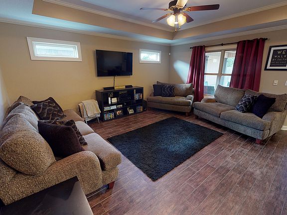Highlights include wood grain tile flooring, huge kitchen island with granite countertops, stainless appliances and pantry, whole house surround sound, separate vanities, corner tub and tiled shower in master bath, upgraded cabinetry and utility sink in the laundry room, oversized outdoor entertainment porch, sprinkler and security systems!