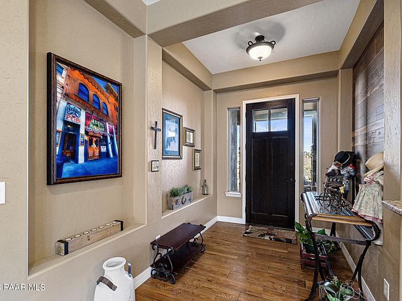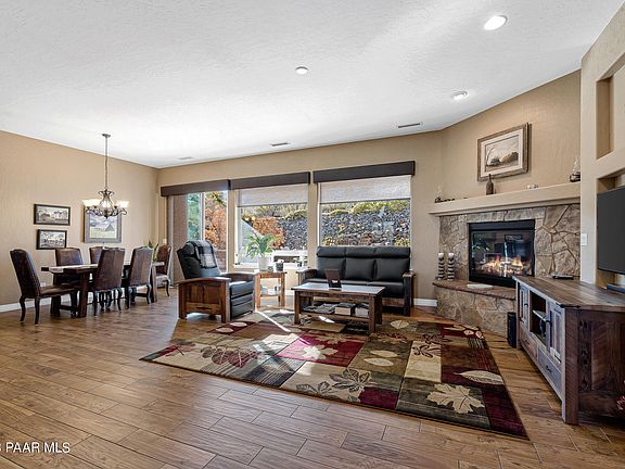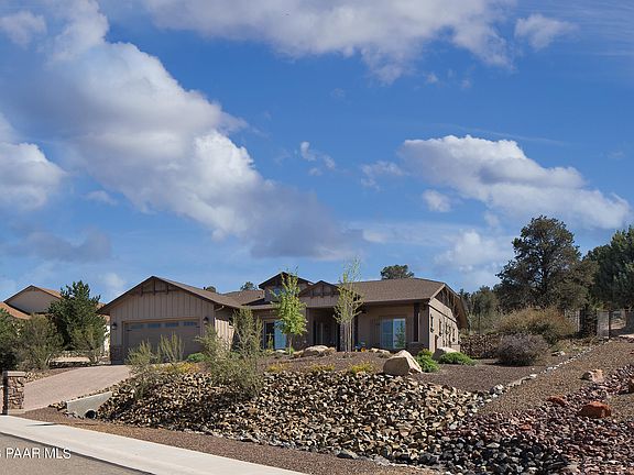Carefree easy living with everything you want, a single level 2210 sf home featuring 3 bedrooms, 2.5 baths, and a 2-car garage set in the upscale neighborhood of Prescott Highlands. This Carrington 2014-built home is well-appointed, and you'll love the layout. The spacious eat-in kitchen offers granite counters, large island, breakfast bar and breakfast nook. The great room features a corner rock fireplace & is open to a large dining area. The very private backyard off the dining area opens to a lovely, covered stone patio for al fresco dining. The beautifully landscaped & fenced backyard has a picturesque waterfall. Thoughtful upgrades include wood-look tile floors, niches in the hallways, plantation shutters, Japanese copper tub in the master bath, wash barrel basin in the powder room.
