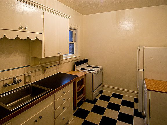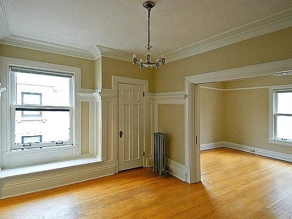 This second floor one bedroom apartment features tall ceilings, gorgeous chandelier, hardwood floors, detailed trim, claw foot tub and vintage fixtures.