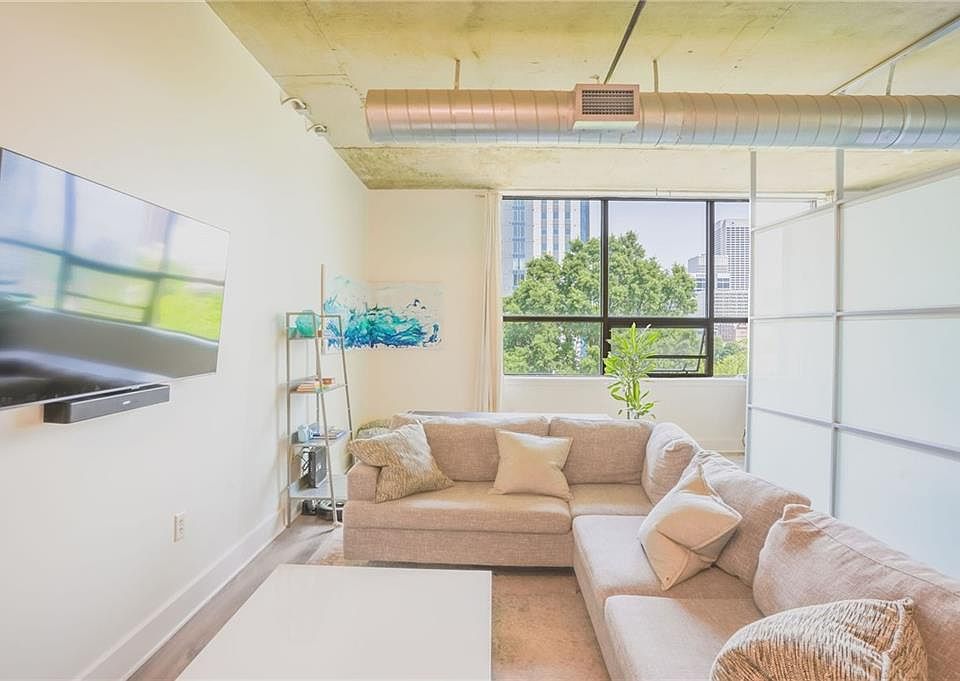 Come live in the bustling Midtown/Downtown Centennial Park neighborhood in this beautiful loft that will not disappoint! Enjoy expansive views from this beautiful loft that will not disappoint! Enjoy expansive views from your sofa of Midtown or go to the roof top terrace to see the entire city. Walkable to all things Downtown, this location is super pedestrian friendly with the ability to walk to loads of dining options, Mercedes Benz Stadium GA Aquarium, State Farm arena, and so much more. This home features new hardwood floors, freshly painted, extra large walk in closet, deeded storage space that’s climate controlled, deeded parking, and a full service concierge. This boutique loft building is all about location!