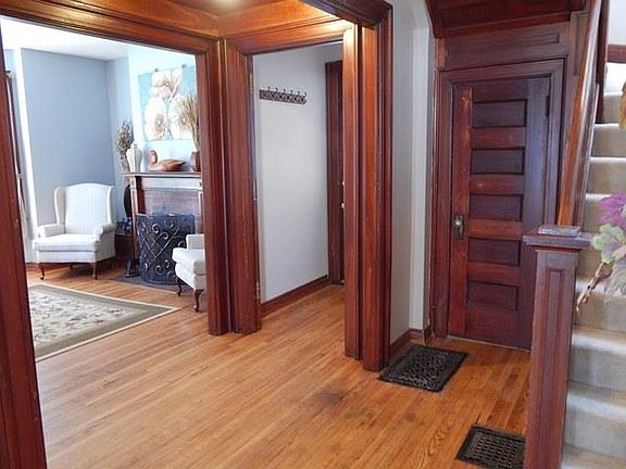Lovely 4 bedroom & 2 bath Victorian, with the best of both worlds. Original vintage interior, woodwork, bead board, gleaming hardwood floors, open spindled staircase into welcoming/greeting room. Enclosed front 3 season sunporch, living room w/fireplace, dining room w/bay window. Large updated kitchen w/family-entertainment sized center island, full wall of custom bead board pantry cupboards, wet bar w/wine rack@ one end, plus full bath. 4 bedrooms & 1 full bath on the 2nd floor. Full basement for storage, new windows & siding, fenced yard w/swing set, covered patio, & detached garage. Walk to shopping, all schools, & hospital.